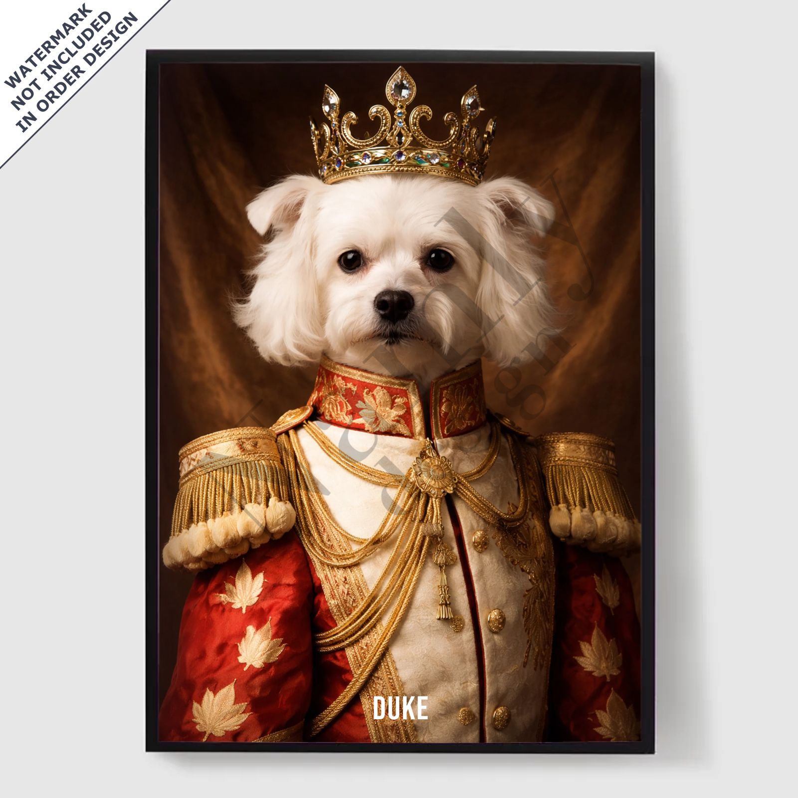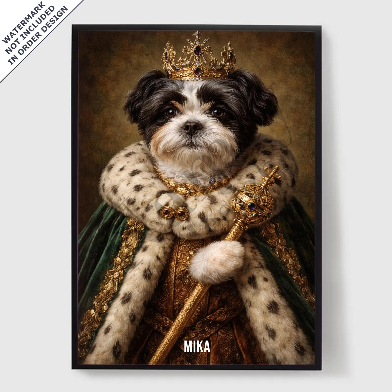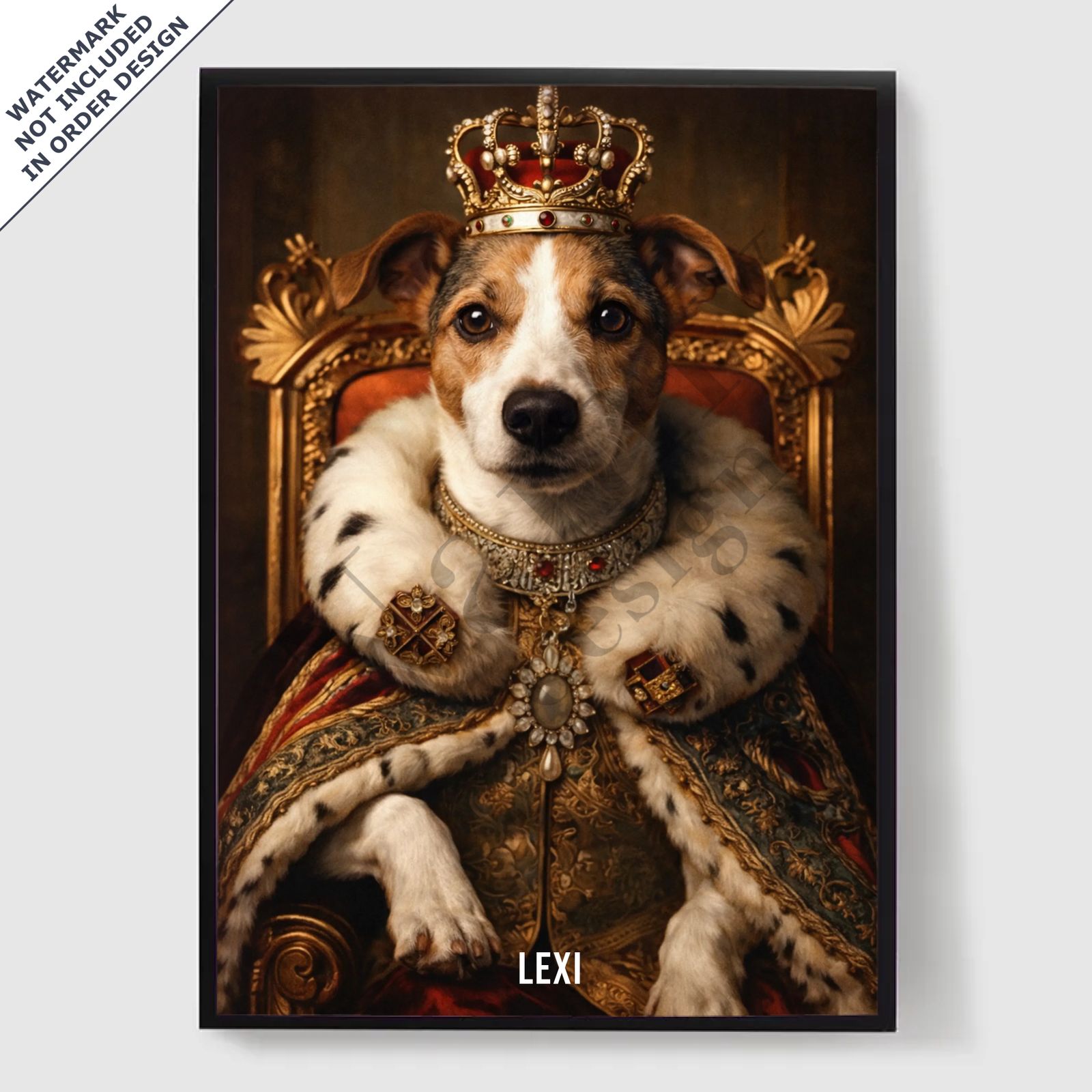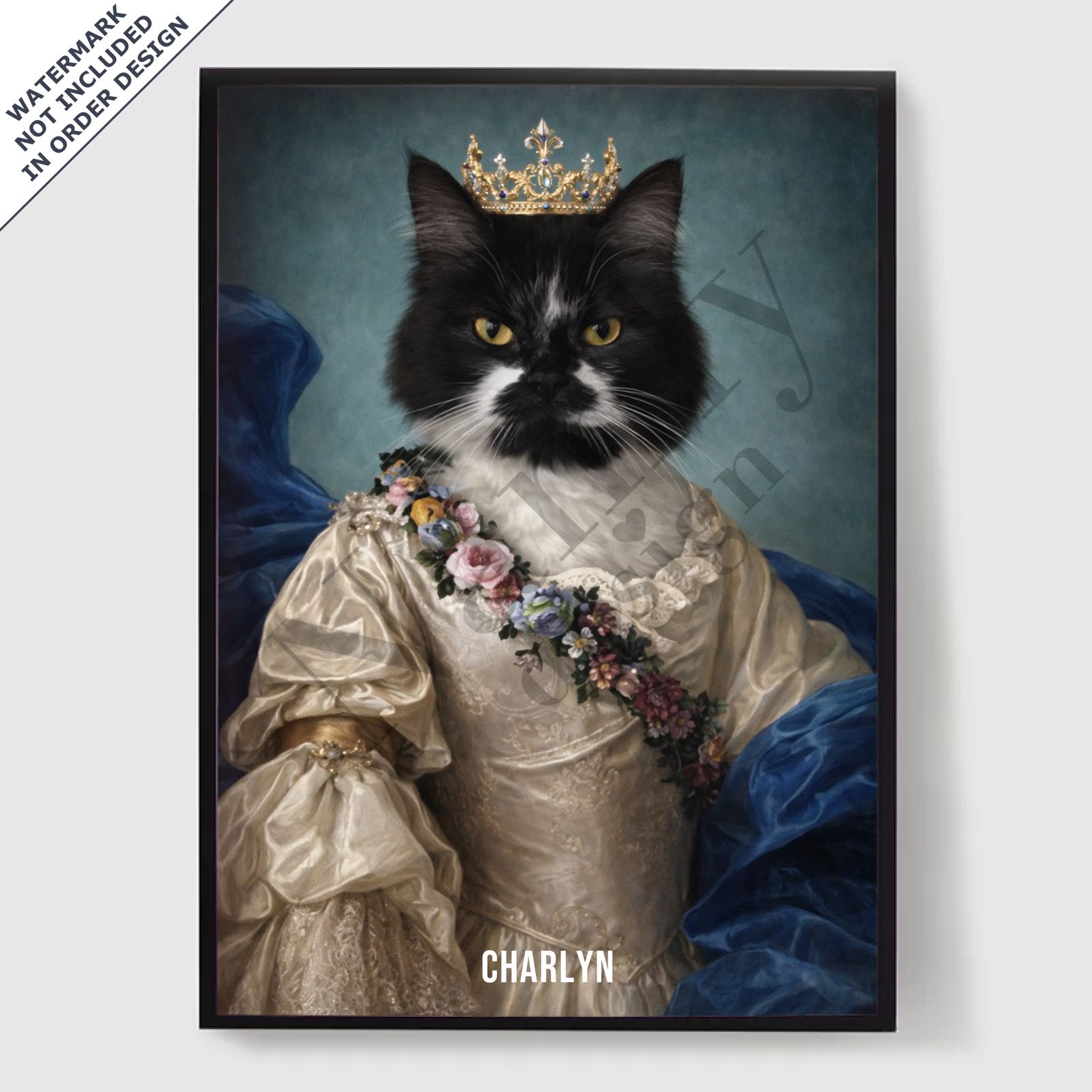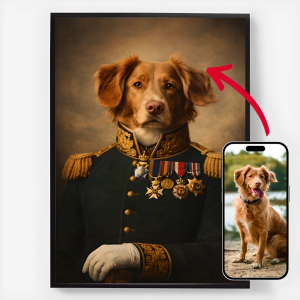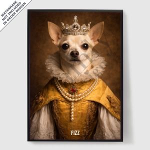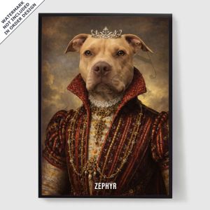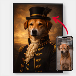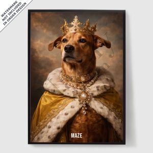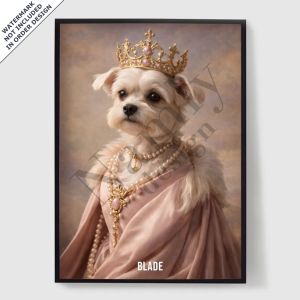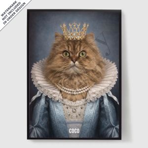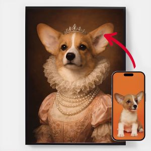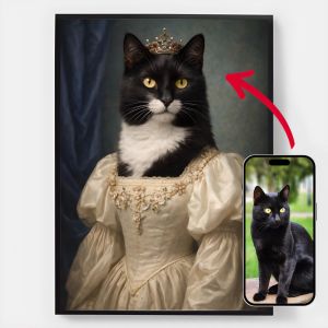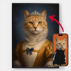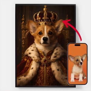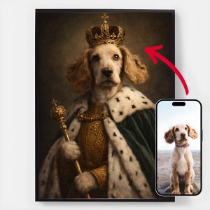 Våre personaliserte kongelige kjæledyrportrett-plakater er en unik måte å vise frem kjæledyrets personlighet på. Hvert stykke er skreddersydd, og bringer frem en kongelig side av kjæledyret ditt som du vil elske. Disse plakatene er perfekte gaver til dyreelskere eller en sjarmerende tillegg til hjemmeinnredningen din. Med høykvalitets utskrifter og forskjellige størrelser tilgjengelig, er det enklere enn noensinne å finne det perfekte portrettet.