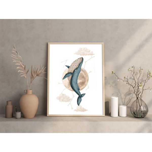 Denne plakaten har en vakker skildring av en hval som svømmer med månen og stjernene i bakgrunnen. Det rolig design bringer et snev av fantasi og ro til ethvert rom. Perfekt for natur- og kunstelskere. Produktet inneholder bare en plakat.