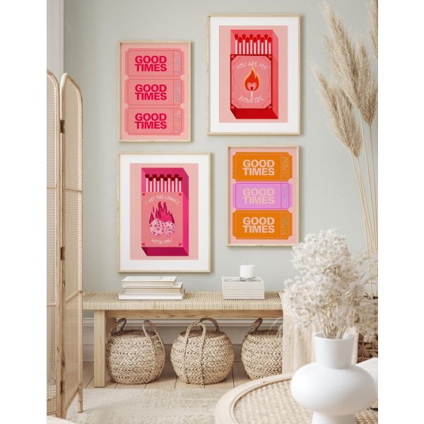 Lys opp rommet ditt med 'Good Times' plakatkolleksjonen. Med lekende kunst og livlig tekst som 'Good Times' og 'You Are My Bonfire', er disse plakatene en perfekt tillegg til ethvert moderne hjem. Produktet inneholder kun et sett av 4 plakater.