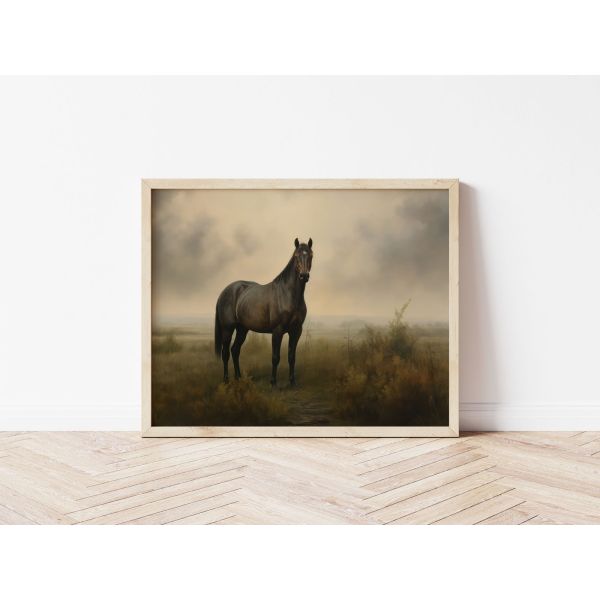 Denne plakaten har et fantastisk kunstverk av en hest som står i en tåkete mark, og fanger naturens rolige skjønnhet. Den detaljerte fremstillingen av hesten mot en subtil bakgrunn gir dybde og ro til ethvert rom. Produktet inneholder kun én plakat.